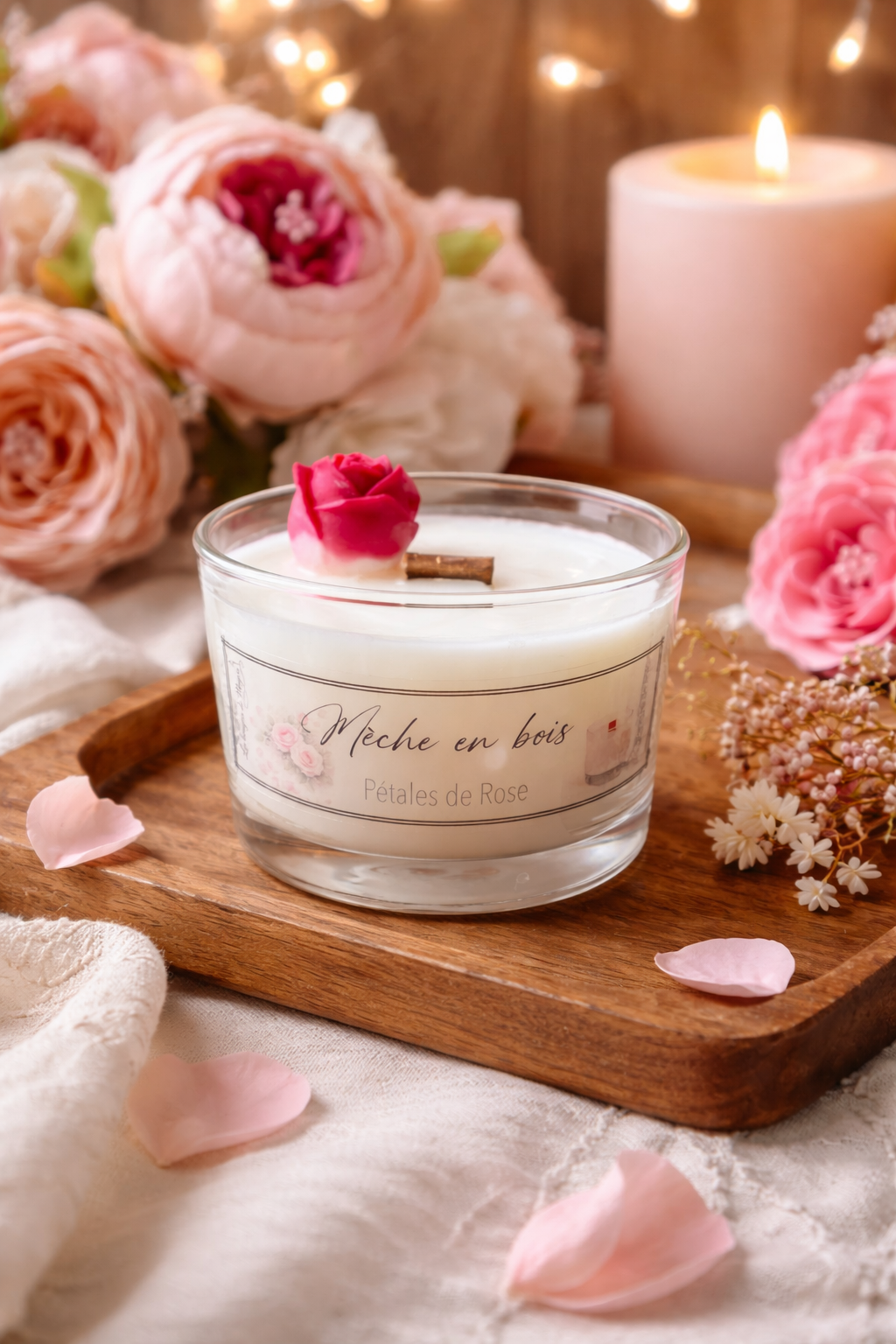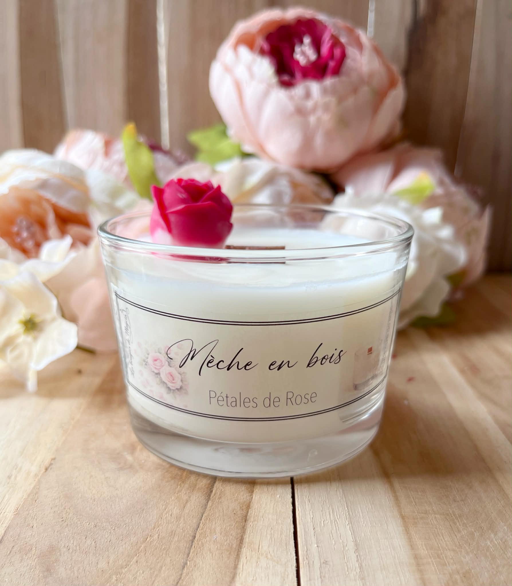 Bougie parfumée rose artisanale – Une ambiance chaleureuse grâce à la mèche en bois