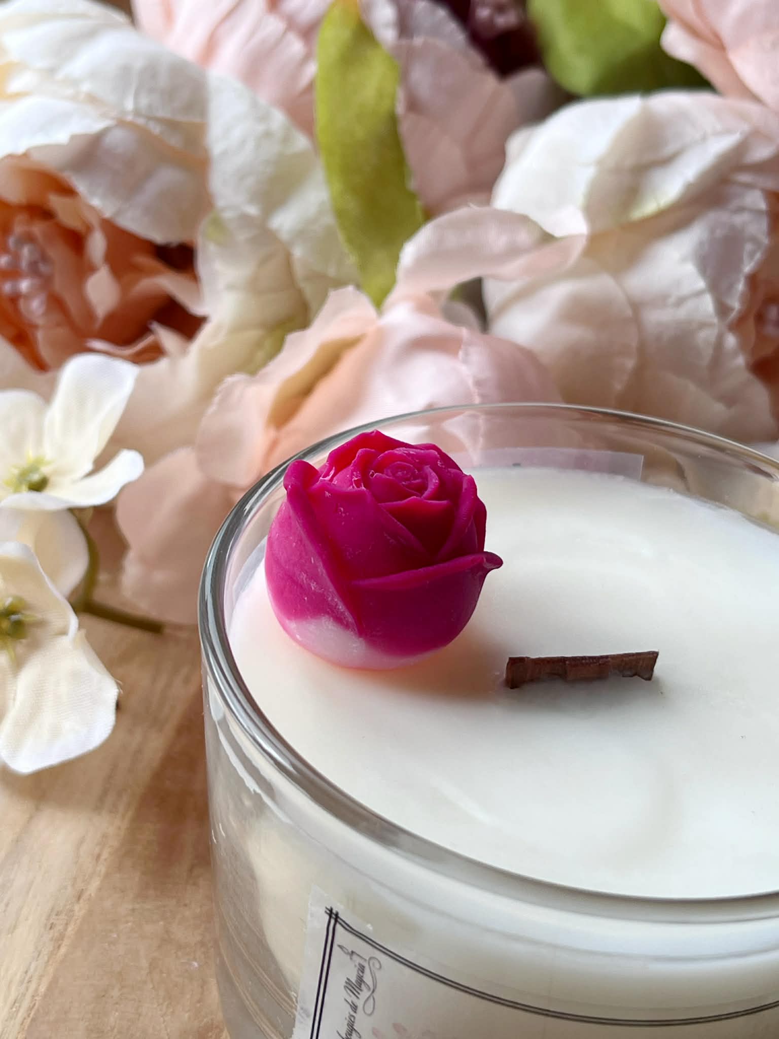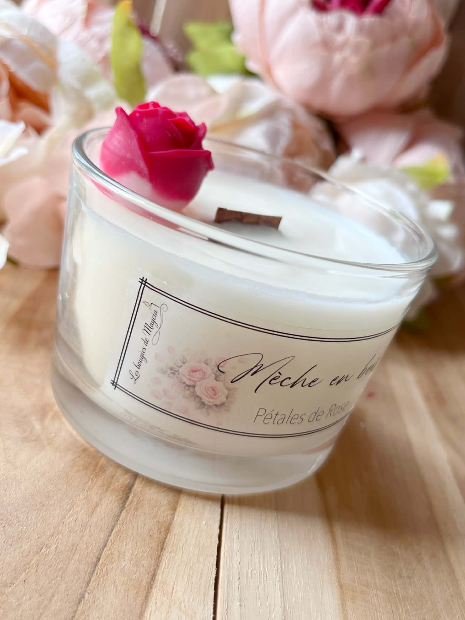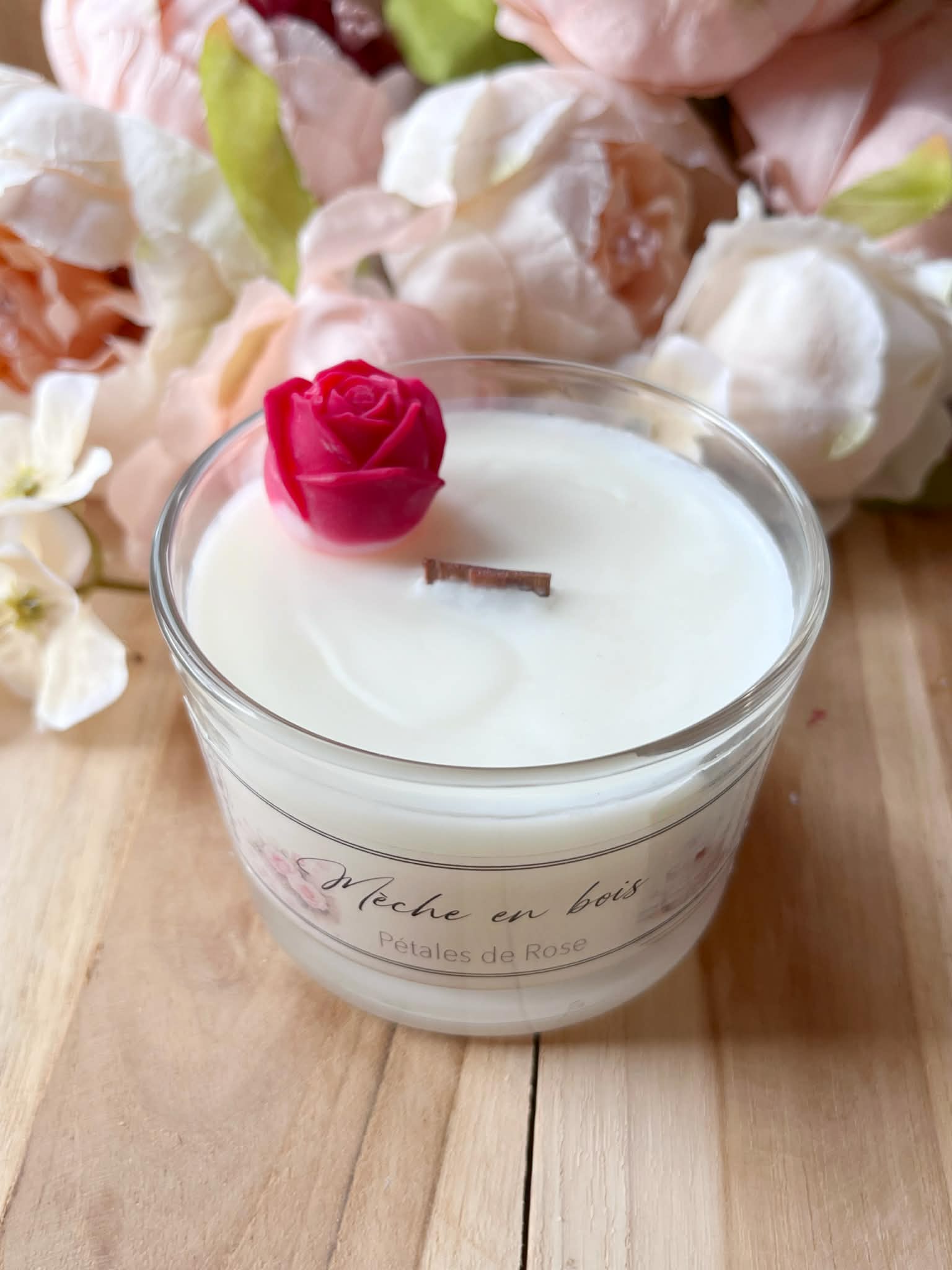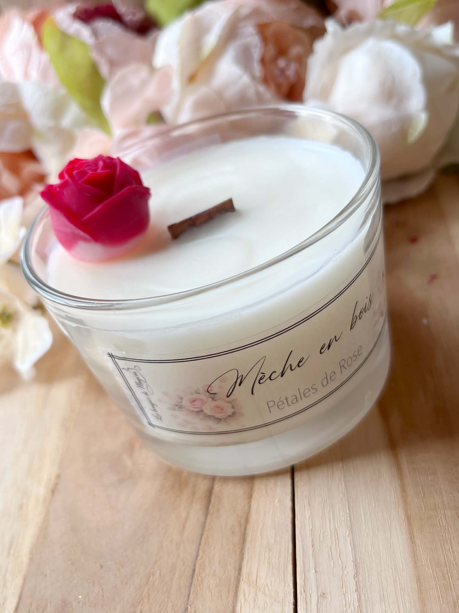 Bougie parfumée rose artisanale – Mèche en bois