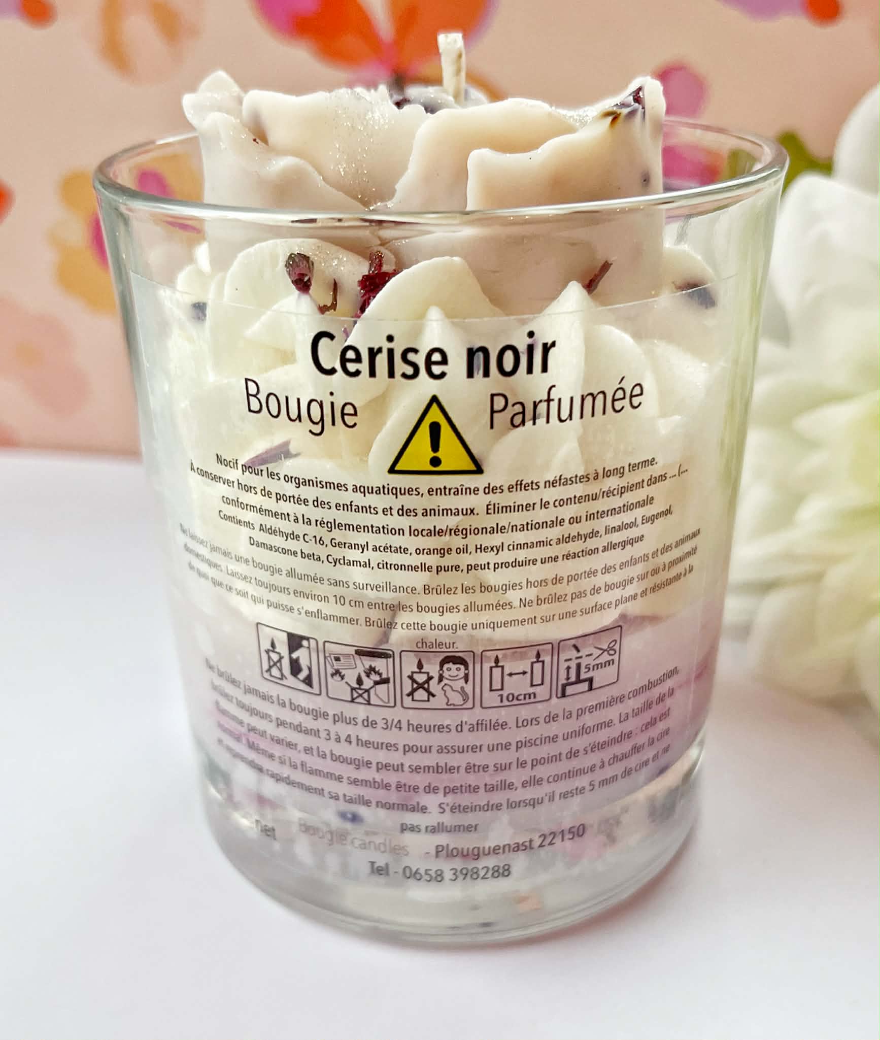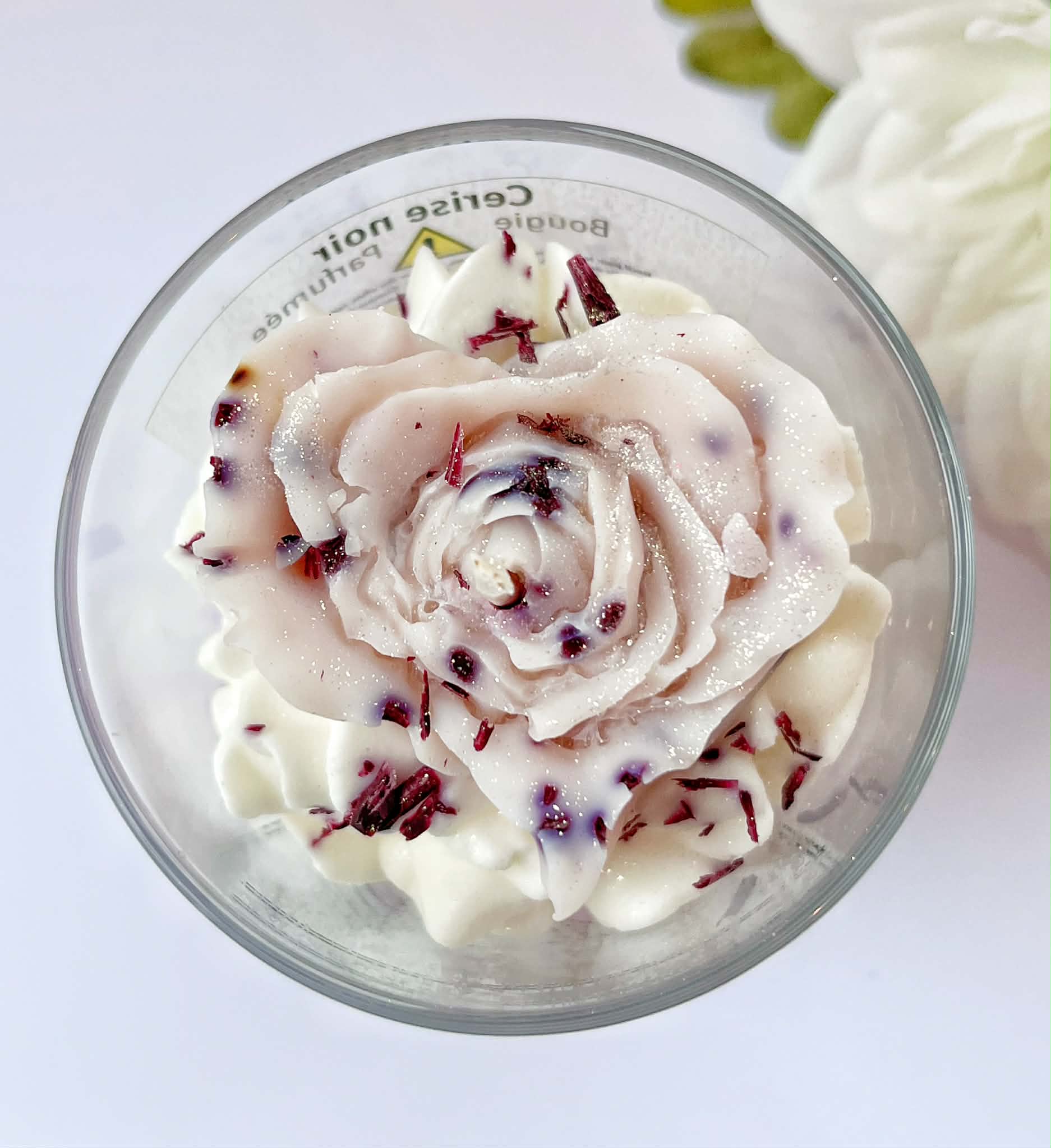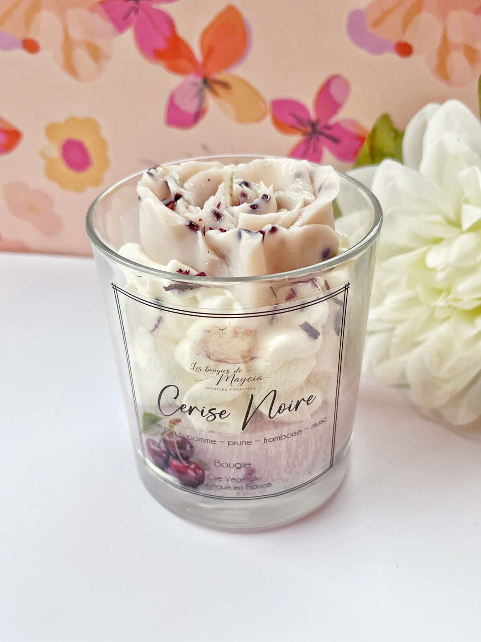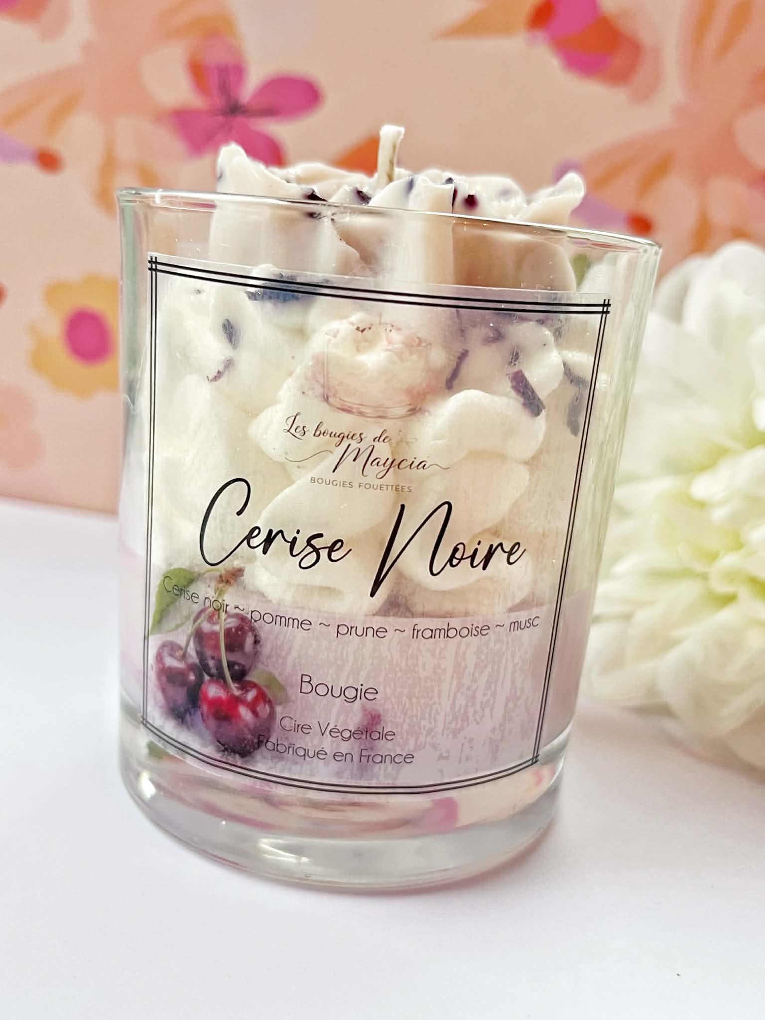Offrez-vous un moment de pur plaisir avec notre bougie fouettée à la cerise noire, une création artisanale aussi séduisante par son apparence que par son parfum envoûtant. Fabriquée à la main avec soin à partir de cire de soja 100 % naturelle, cette bougie allie esthétisme, qualité et respect de l’environnement. Elle est sublimée par un magnifique topper floral en forme de cœur, délicatement façonné à la main, qui en fait une véritable pièce décorative.