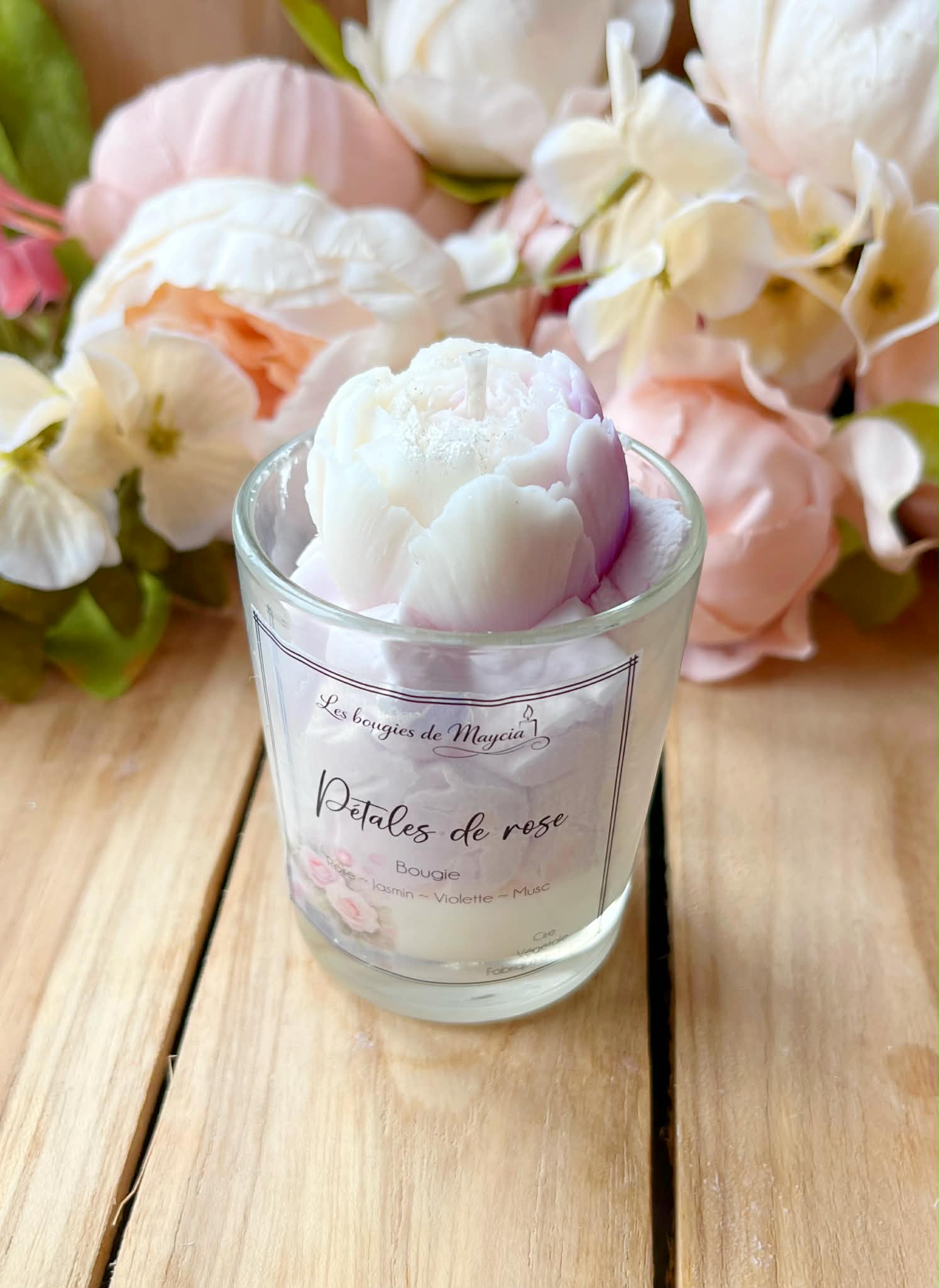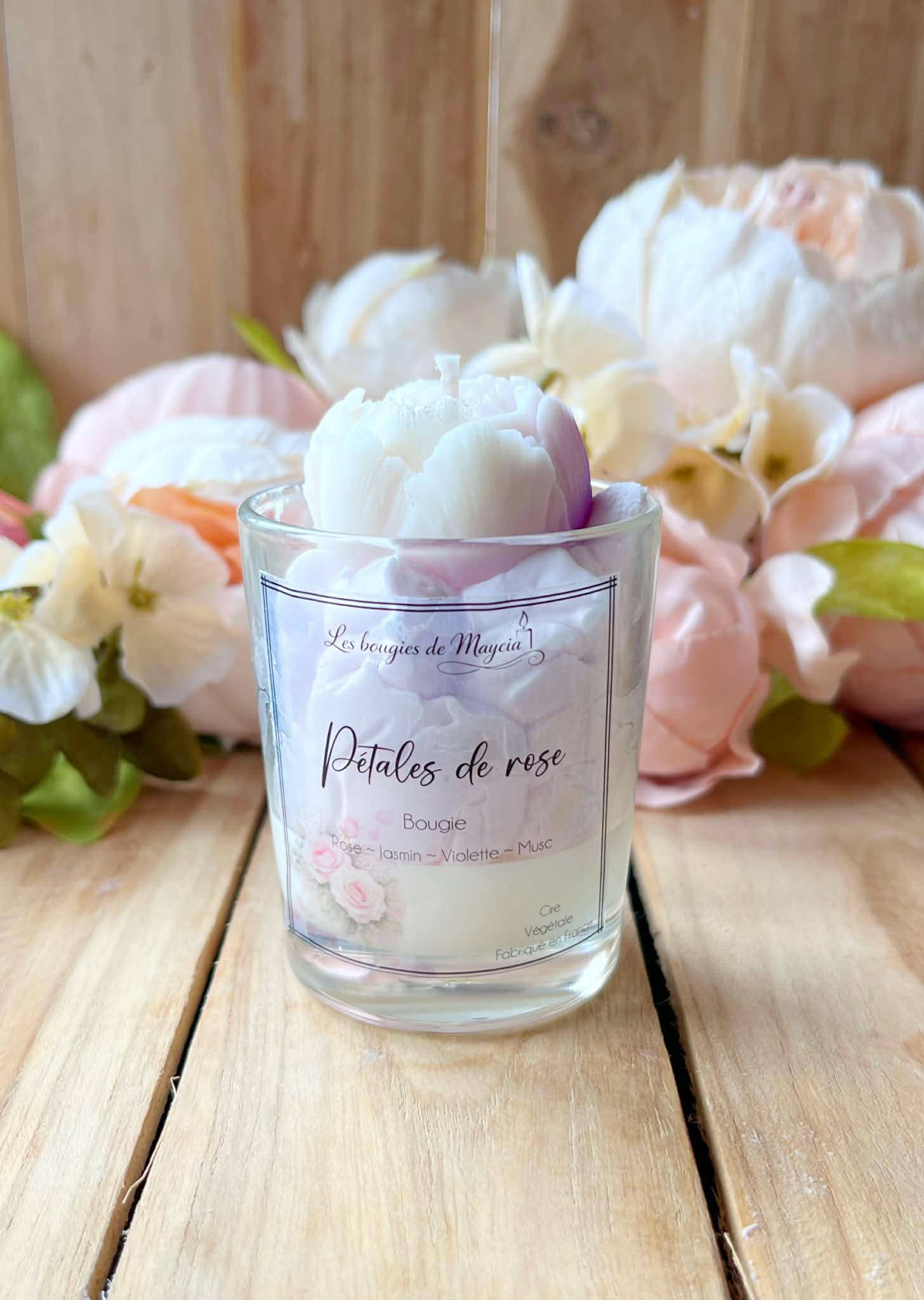 Nos bougies sont composées d’une cire végétale fouettée et d’un topper décoratif (fleur/cœur en cire).