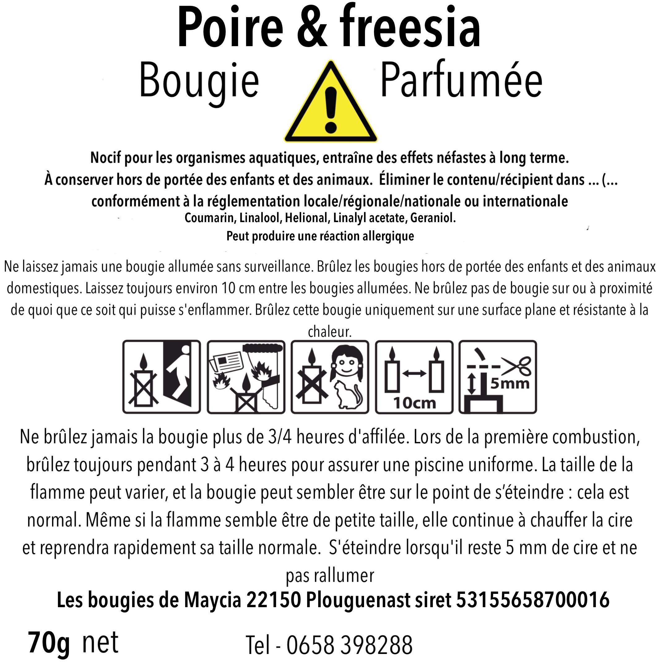 Pour une combustion optimale, laissez la bougie brûler jusqu’à ce que la cire fonde uniformément sur toute la surface lors de la première utilisation. Placez toujours la bougie sur une surface résistante à la chaleur et coupez la mèche avant chaque allumage.