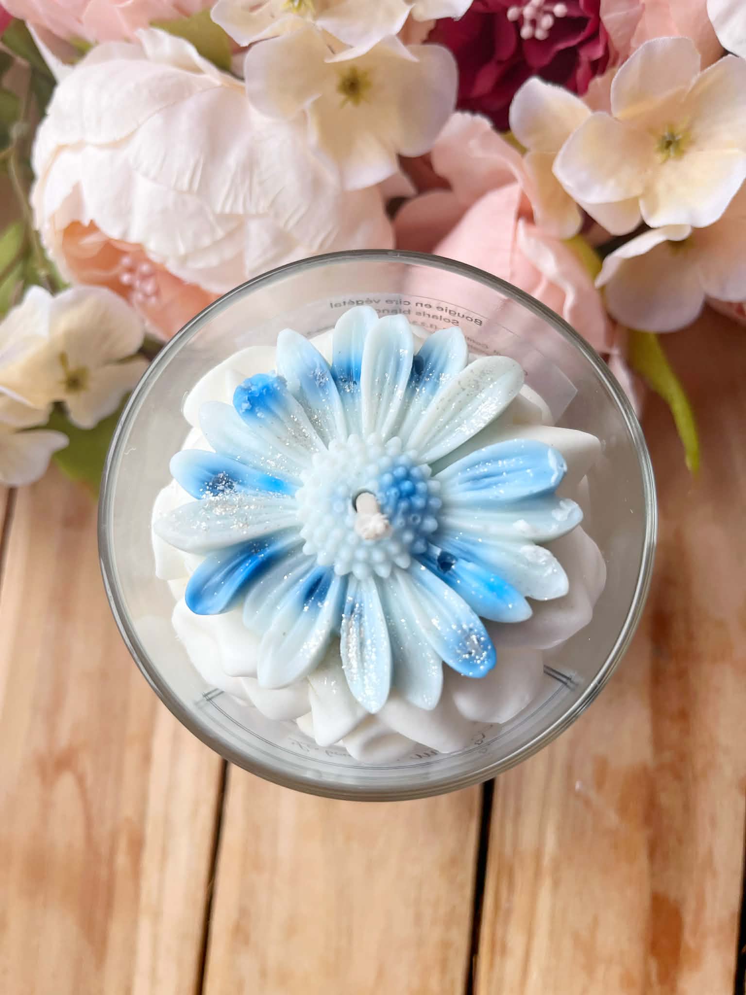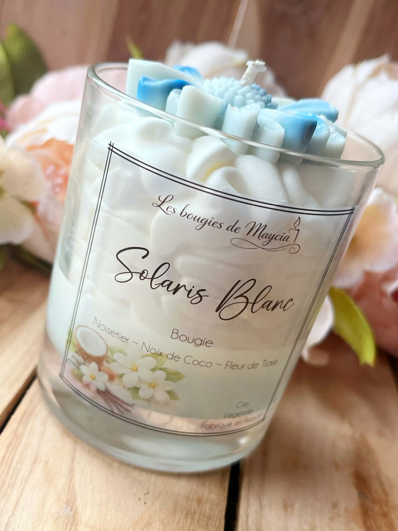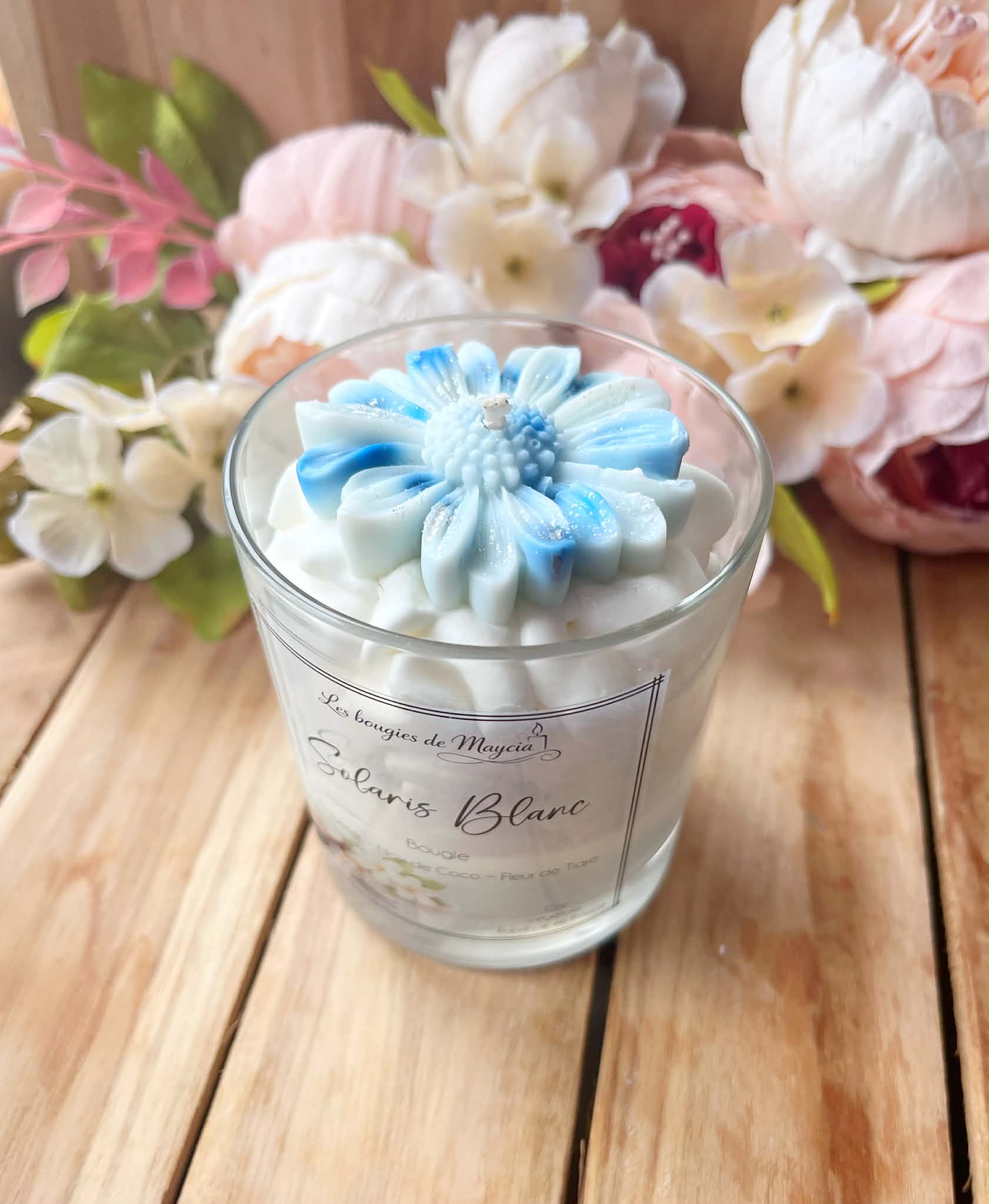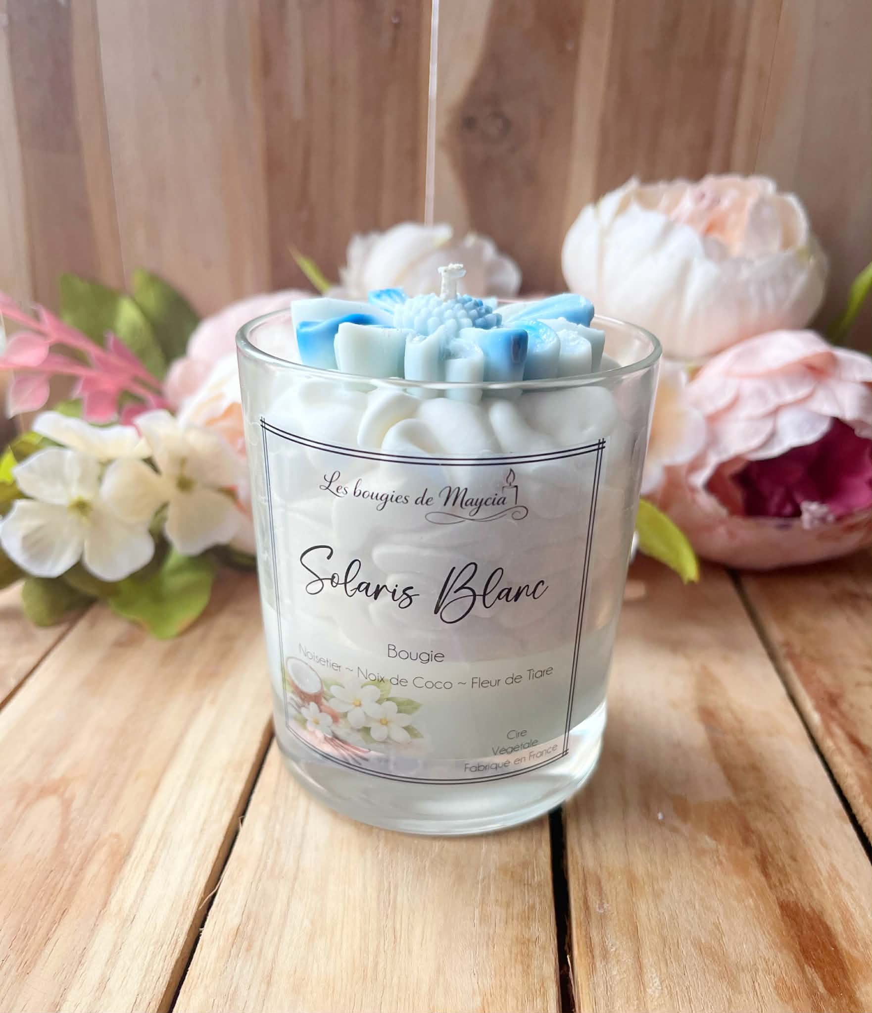 Nos bougies sont composées d’une cire végétale fouettée et d’un topper décoratif (fleur/cœur en cire).